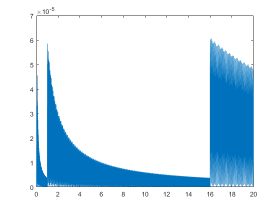 flbetainit(4,16,99); x = linspace(0,20,10000); X = flbeta(x); close plot(x,relerr(x,X))