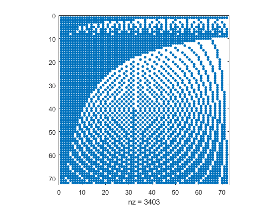 prec = 2; beta = 9; flbetainit(prec,beta,99); x = flbetasequence(1,pred(flbeta(beta))); numElmts = length(x) M = zeros(numElmts); for k=1:numElmts M(k,:) = ( (k*x)/k == x ); end close spy(M)
