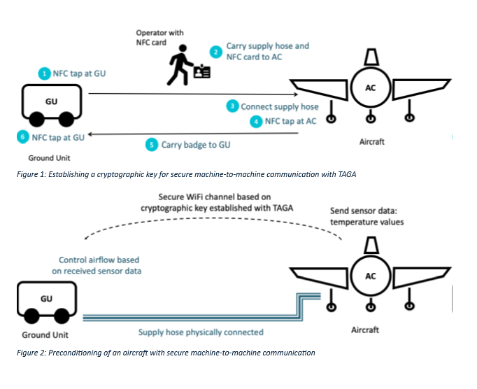 Der Ansatz hinter TAGA besteht darin, dass ein menschlicher Bodenoperator die Bodeneinheit und das Flugzeug mithilfe eines Near Field Communication (NFC)-Systems koppeln kann. NFC ist eine drahtlose Kommunikationstechnologie mit kurzer Reichweite, die hinter vielen alltäglichen Anwendungen steht. Beispielsweise ermöglicht NFC bei kontaktlosen Zahlungen die Durchführung von Zahlungsvorgängen, indem eine Karte oder ein Smartphone an ein Zahlungsterminal gehalten wird. Bei TAGA ist jede Bodeneinheit und jedes Flugzeug mit einem NFC-Lesegerät ausgestattet, und der Bediener erhält eine NFC-Karte.